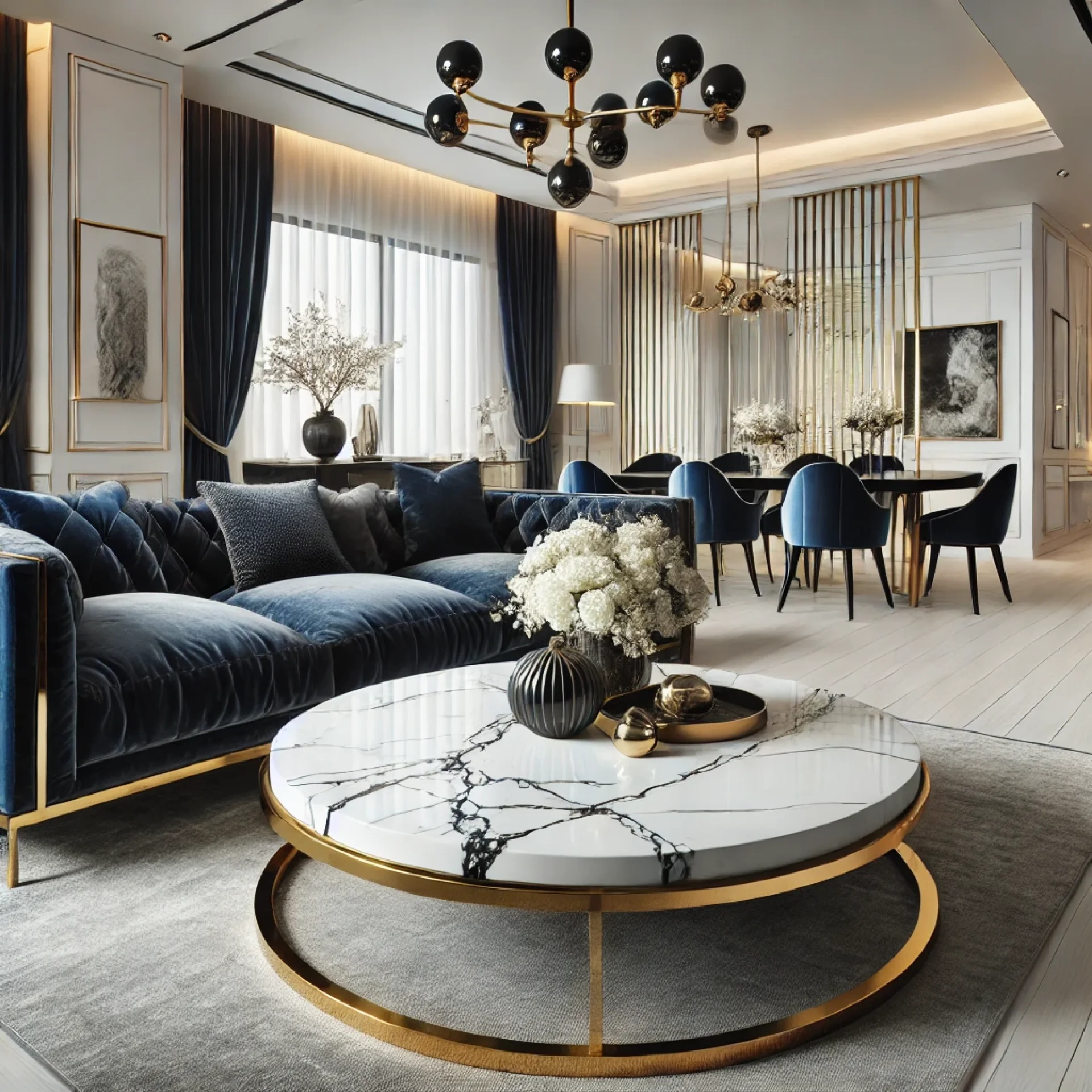 ไอเดีย: วางโต๊ะหินอ่อนกลางห้องนั่งเล่น จับคู่กับโซฟากำมะหยี่สีเข้ม เพิ่มแจกันดอกไม้หรือเทียนหอมสุดหรู