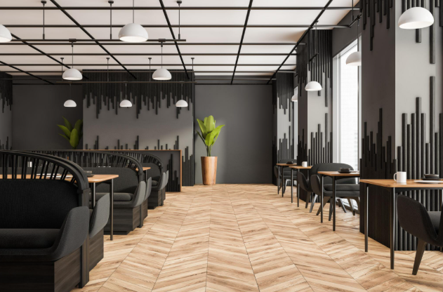• ตัวอย่างเช่น การใช้พรมสีเทาอ่อนใต้โต๊ะรับประทานอาหาร ช่วยเพิ่มความนุ่มนวลและลดเสียงสะท้อนในร้าน
